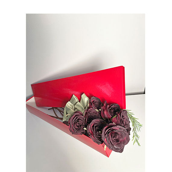 A bold arrangement „ Scarlet forever „ of deep red roses in a red box, for those who love drama and passion. Striking, long-lasting, unforgettable and „ Scarlet Forever „ !