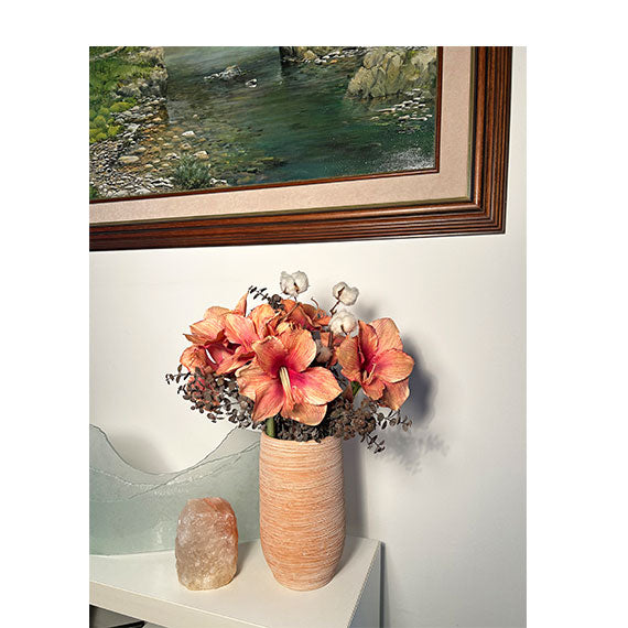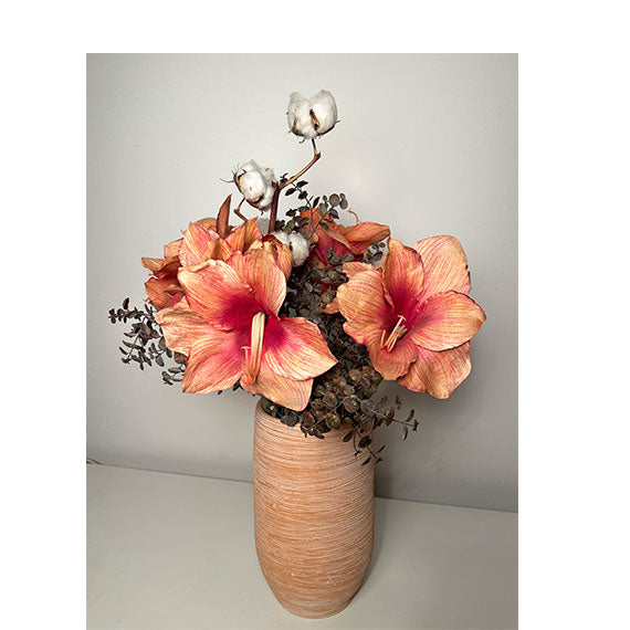 Warm tones of amaryllis, perfectly balanced with soft cotton flowers in a gorgeous ceramic vase, create a sophisticated look that enhances any space. Classic beauty and „ Timeless Grace „ that lasts all year round.