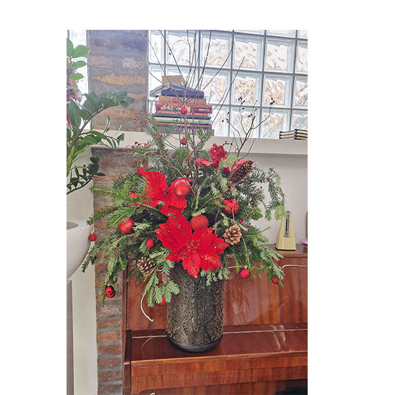 Welcome the holidays with a festive New Year arrangement in a lantern "Winter Lux lantern", created from evergreen twigs, red berries and carefully selected decorative details in warm red tones.