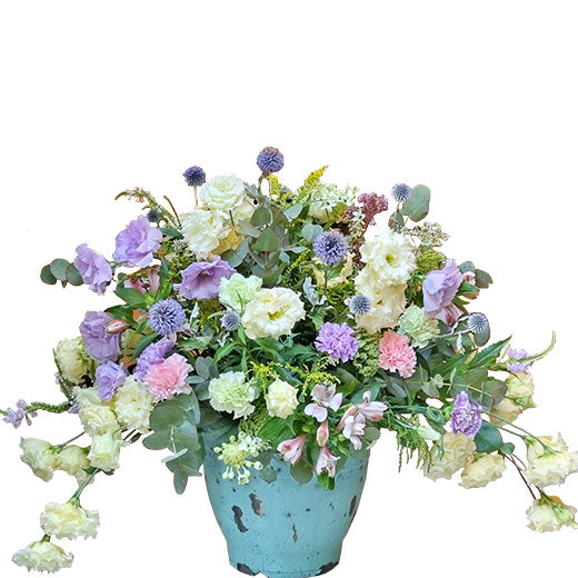 „Ces fleurs subtiles“, composées d'alstroemerias, d'œillets, de lisianthus et de fleurs de saison, si fraîches et enjouées, dans des tons harmonieux de violet, de blanc et de jaune, apportent joie, apaisement et réconfort ! Rafraîchissez la journée de quelqu'un en un instant, remerciez-le avec des fleurs, offrez votre soutien ou félicitez vos proches pour leur anniversaire… Offrez une véritable composition florale printanière ! Fraîcheur, harmonie des couleurs et spontanéité rendent cette composition florale magiquement attrayante ! Dim 50x 60 xm