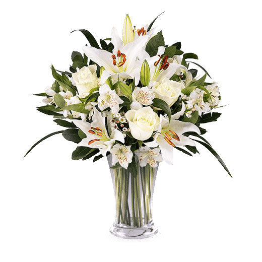 Un bouquet de fleurs mélangées en blanc, comme créé pour féliciter un anniversaire, un mariage ou la naissance d'un bébé... Mais aussi idéal pour l'envoyer à vos proches comme ça. Si vous ne pouvez pas les rejoindre, montrez en envoyant un bouquet ‚‚ Merveilleuse journée‚‚ que vous êtes toujours avec eux dans vos pensées... (Vase non inclus).