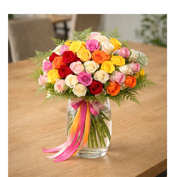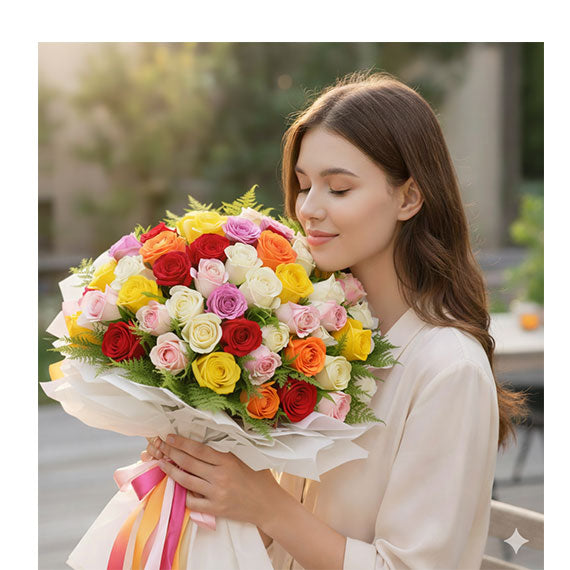 Raskošne ruže u crvenim, žutim, narandžastim, belim, roze i ljubičastim tonovima nežno se prepliću u bogatom aranžmanu, dok ga detalji paprati čine još svežijim. Sve je upakovano u čisto belo pakovanje i završeno razigranim trakama - baš onako šarmantno, u Teleflorinom stilu. Ovaj prelepi buket šapuće, nežno i sa osmehom, sve tvoje poruke !