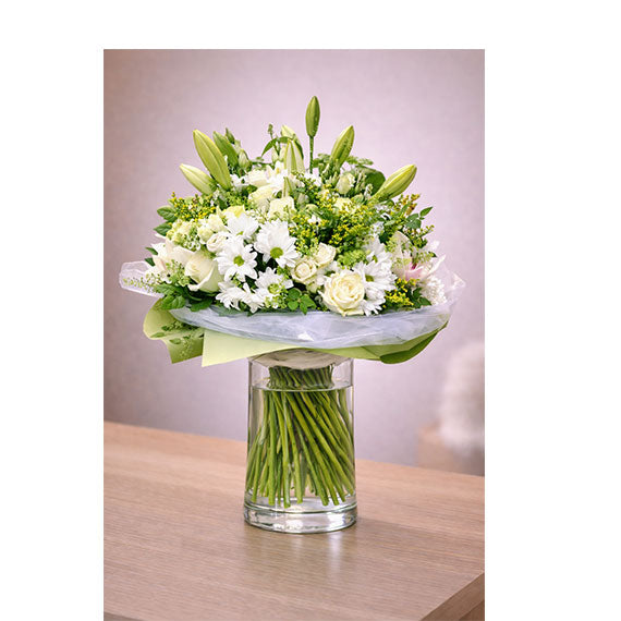 Ovaj buket govori umesto Vas, kroz čistoću belih ruža, eleganciju ljiljana i nežne tonove pažljivo biranog sezonskog cveća. Svaki cvet nosi poruku, o ljubavi, poštovanju, podršci ili tihom sećanju, spojenu u skladnu celinu koja odiše mirom i sofisticiranošću. „Čista Emocija“!