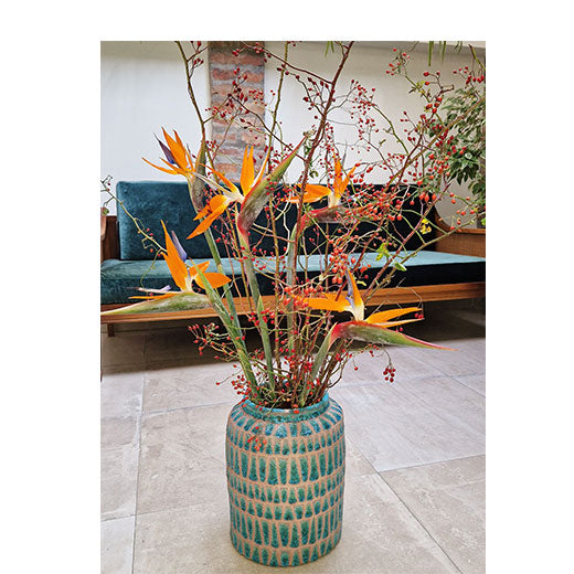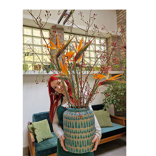Visoke grane crvenih bobica uzdižu se ka nebu, smelo i neukrotivo. Među njima cvetovi strelicije, poput tropskih ptica u letu, u vatrenoj narandžastoj i safirno plavoj boji, izranjaju iz prelepe keramičke vaze ukrašene tirkiznim detaljima, koja priziva more i nebo. Ovaj jedinstveni cvetni aranžman je simfonija boja i oblika — „ Divlji, elegantan, nezaboravan poklon „ za Vaše voljene ! Dim. 85x 40cm