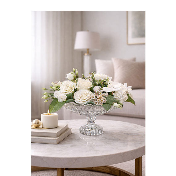 Nežan i smiren cvetni aranžman od belih ruža, orhideja i pažljivo odabranih sezonskih cvetova, oplemenjen svežim zelenilom, u elegantnoj staklenoj posudi. Ovaj umirujući aranžman nosi poruku mira, harmonije i iskrene pažnje.