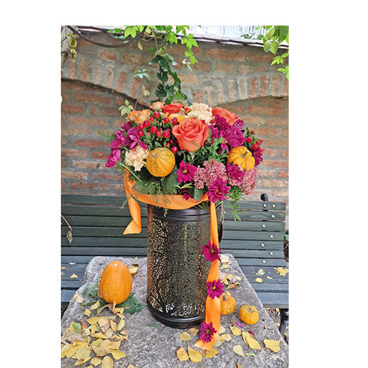 Ulepšajte svoj prostor toplinom i bojama jeseni uz ovaj divan i stilizovani buket u lanterni. Kombinacija nežnih narandžastih, crvenih i ciklama tonova cveća, uz bogato zelenilo, sitne crvene bobice i mini tikve, donosi osećaj udobnosti i prirodne lepote. Svaki detalj pažljivo je složen, sa mnogo ljubavi, kako bi Vaš dom ili poklon za dragu osobu zračio toplinom i lepotom jeseni. Slavite „ Magiju Jeseni“ ! Visina laterne 36x 17cm, sa cvećem 45x 23cm