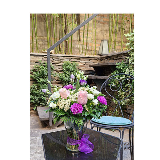Želite da poklonite dragoj osobi „ Mali znak pažnje „? Odlična ideja! Ova Teleflorina šarmantna cvetna kompozicija, veseli cvetovi lizijantusa, ruža, karanfila i sezonskog cveća u staklenoj vazi, odabrani su pažljivo da suptilno prenesu radost, toplinu i prijateljske misli. Poklonite je s'radošću „ Mali znak pažnje „!