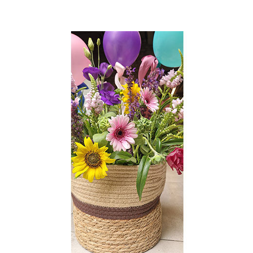 Ova živahna i radosna mešavina cvetova suncokreta, gerbera, lizijantusa, sezonskog cveća i balona je savršen način da proslavite dolazak novog života. Ovaj veseli cvetni aranžman u korpi je pun energije i uzbuđenja, odražava radost i čudesno radjanje novog života. «  Prasak boja i radosti « za Vaše najdraže novopečene roditelje !