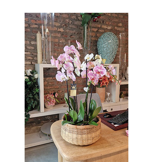 Egzotična kompozicija sa 3 orhideje u posudi koja pleni svojom elegancijom i lepotom. Idealan poklon za proslavu svih dragocenih trenutaka u životu ! « Sofisticirani šarm Orhideje «, njena delikatna, prefinjena i graciozna priroda zrači lepotom, ljubavlju i snagom. Oboriće s’nogu Vašu posebnu osobu ! Visina 65cm - ISPORUKA SAMO NA TERITORIJI BEOGRADA-