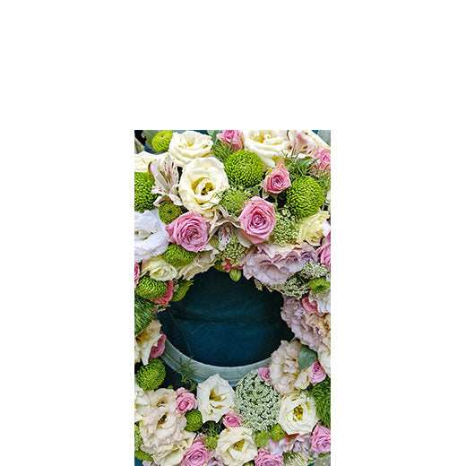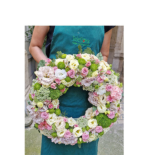 Ovaj Teleflorin « Venac nežnih uspomena « u pastelnim bojama cveća je delikatan i prefinjen cvetni aranžman, koji će odati poslednju počast i stvoriti spokojnu i utešnu atmosferu. Pastelni tonovi ruža, lizijantusa, karanfila i seduma bude mir, nežna i sećanja na pokojnog. (prečnik obruča za osnovni 40cm, srednji 62cm, elegant 72cm)