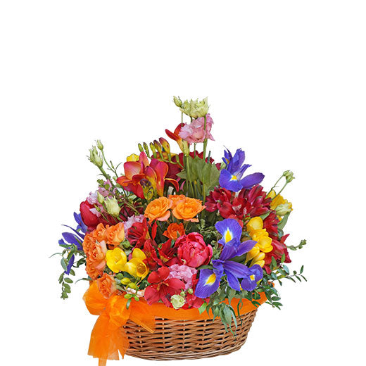 Ova cvetna kompozicija razigranih tekstura, klasično aranžirana koja miriše tako lepo kao što izgleda, pravi je praznik za oči, zar ne? Teleflorina korpa puna cveća, toplih boja ruža, alstromerija, frezija, lizijantusa, u narandžastim, crvenim, ciklama i žutim tonovima, nagllašena ljubičastim irisima i bogatom mašnom, zaista je dobrodošla kombinacija za svaku priliku. Proslavite rođendan najboljeg prijatelja, pozdravite mamu za Praznik Žena, oduševite svoju lepšu polovinu!